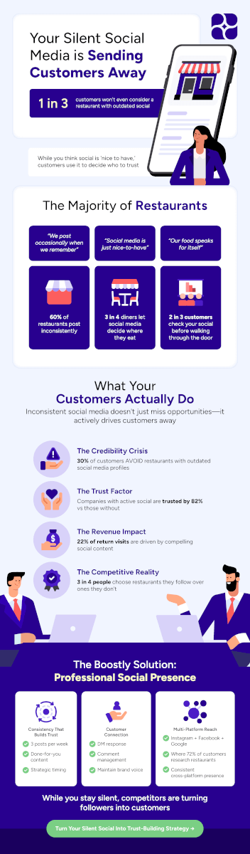 Inconsistent social media posting OR no social media presence OR understaffed team that can't maintain regular content OR wants to build brand awareness locally.